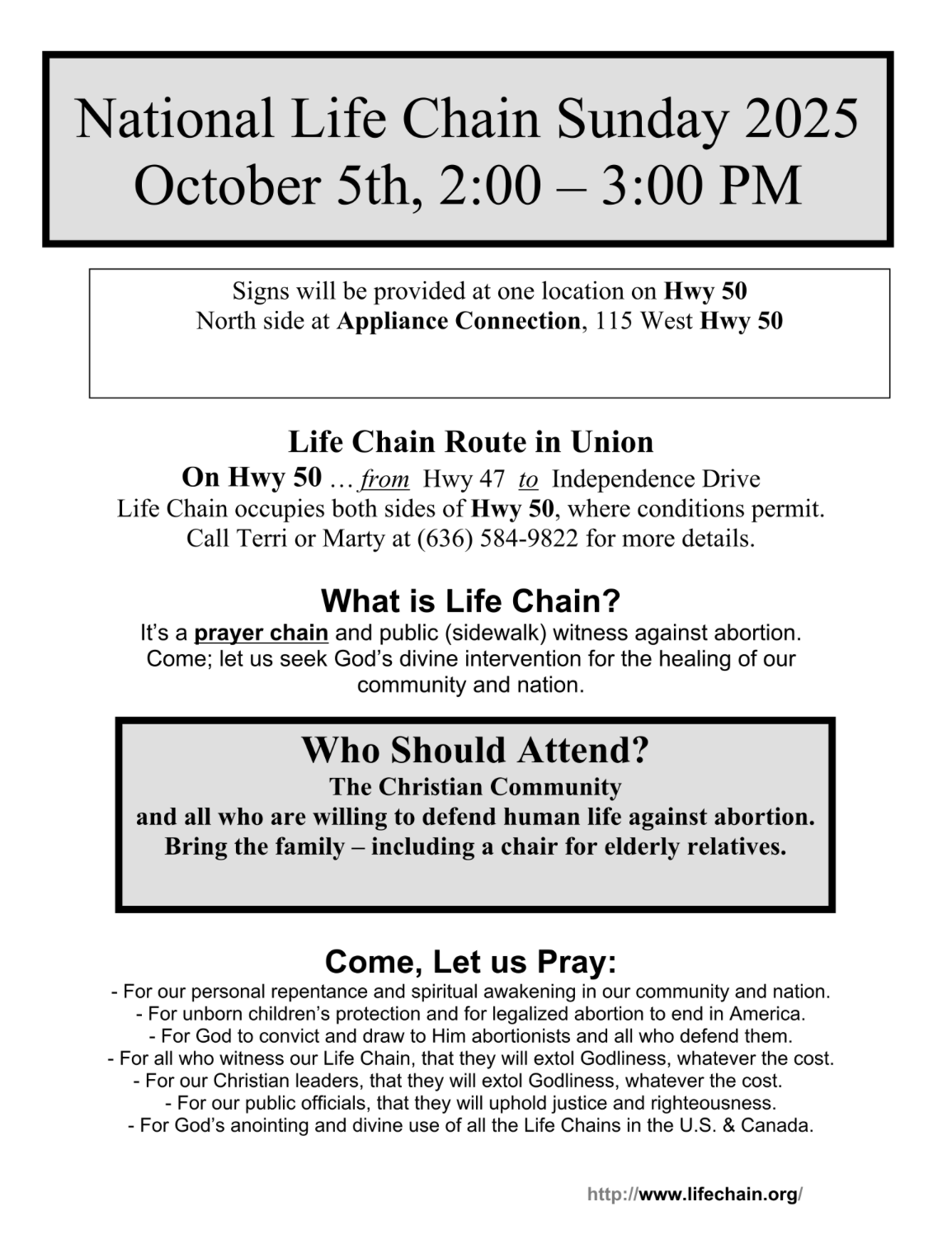 - Life Chain Sunday - 2:00 PM - Highway 50 (Union, MO)
